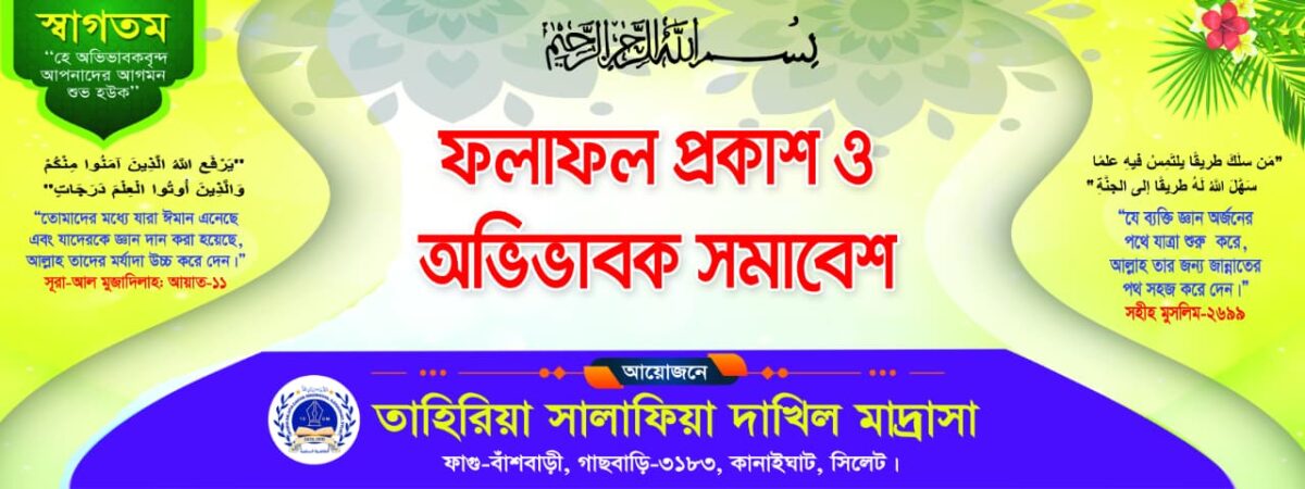 আলহামদুলিল্লাহ । ২০২৫ সনের বার্ষিক পরীক্ষার ফলাফল প্রকাশিত হয়েছে। ফলাফল দেখার জন্য এখানে ক্লিক করুন ( Result – Tahiria Salafia Dakhil Madrasah )