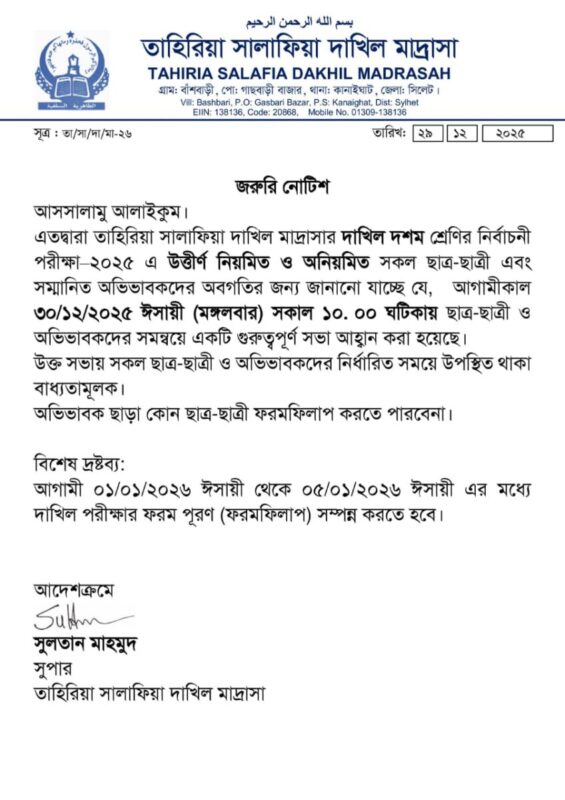 আলহামদুলিল্লাহ । ২০২৫ সনের বার্ষিক পরীক্ষার ফলাফল প্রকাশিত হয়েছে। ফলাফল দেখার জন্য এখানে ক্লিক করুন ( Result – Tahiria Salafia Dakhil Madrasah )